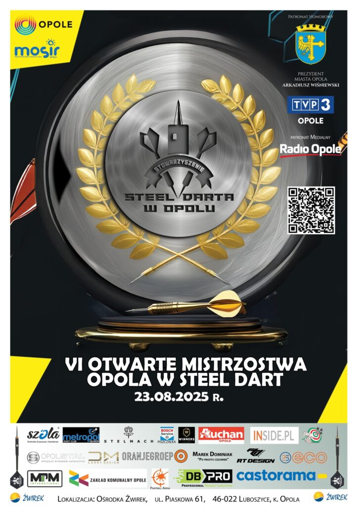 Stowarzyszenie Steel Darta w Opolu zaprasza na VI Otwarte Mistrzostwa Opola w Steel Dart.   Tegoroczny termin zawodów:22-08-2025 r. Deblowe Mistrzostwa Opola w Steel Dart – godzina 18:0023-08-2025 r. VI Otwarte Mistrzostwa Opola w Steel Dart – godzina 11:0024-08-2025 r. Puchar Stowarzyszenia Steel Darta w Opolu – godzina 11:00 Trzydniowe zawody odbędą się po raz